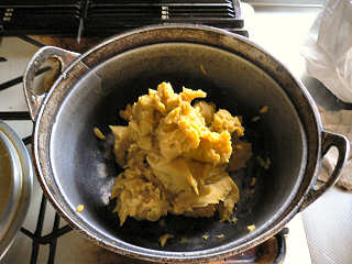 水分がかなり飛ぶまで火にかけたまま、ただひたすらに練り続けます。